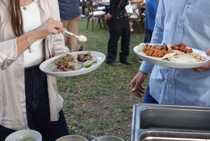 El servicio se presenta con plato de cerámica, tenedor y cuchillo de metal, montado en tablón con bambalina, e incluye estación de salsas en molcajete hechas en el evento, además de botana con mesa decorada para complementar la experiencia.